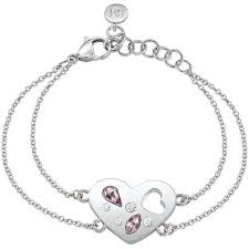 Bracciale in acciaio anallergico, a catena con al centro cuore con cristalli bianchi e viola. Lunghezza 19,5 cm.