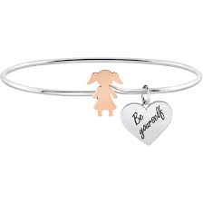 Bracciale in acciaio anallergico rigido con ciondolo a cuore con scritta "be yourself" e bimba rose' centrale.