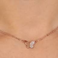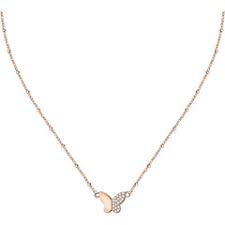 Collana in acciaio anallergico color rose', maglia a catena sottile con palline e al centro una farfalla metà in acciaio rosa e metà con pavé di cristalli bianchi.